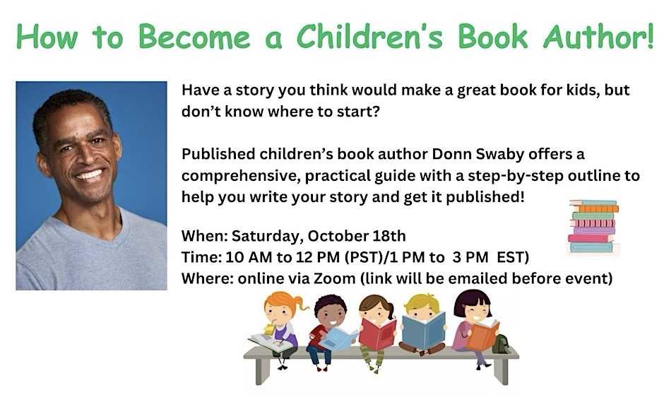 How to Become a Children’s Book Author is an online event I found through Eventbrite. Donn Swaby is a published author who has created a fantastic outline for aspiring authors to write and publish their book ideas. The comprehensive guide outlines board books, picture books, young adult, etc. The guide also mentions subgenres if you want to write fantasy, science fiction, or adventure books.